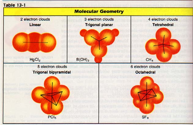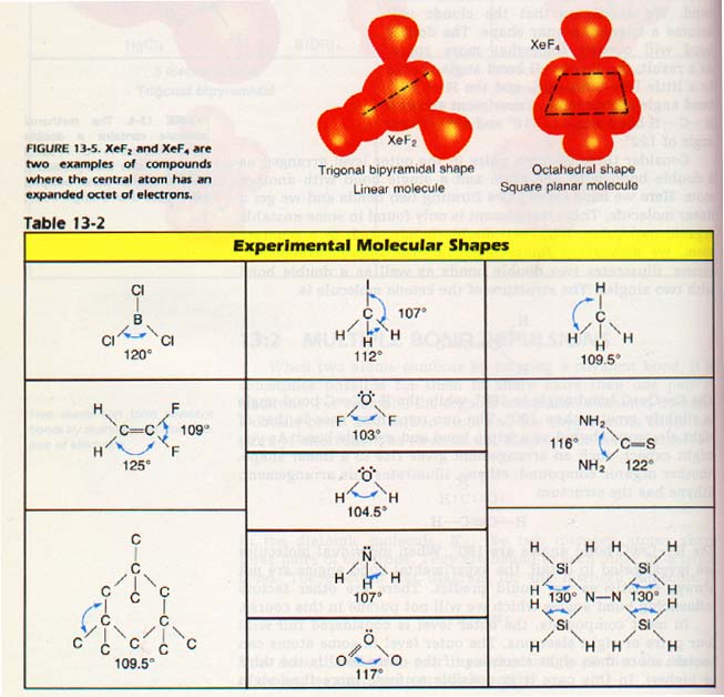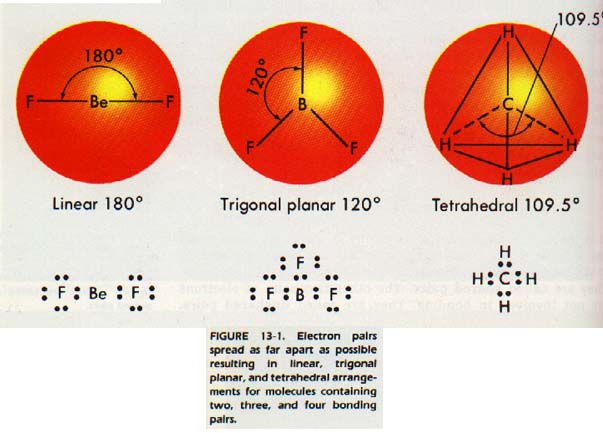 Of course, axes will not all lie in the same plane. The easiest way to them is to imagine them is to imagine a regular tetrahedron. A tetrahedron is a figure having four faces, each of which is an equilateral triangle. The nucleus is at the center and the axes extend out to the corners. 13-1 shows some examples in which each electron pair in outer level is used in bonding to another atom. Can you see a between the number of bonds formed and the molecular shapes?