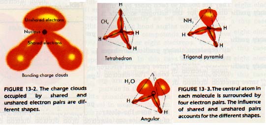 The bonds and unshared electron pairs determine the shape a molecule. An unshared pair is acted upon by only one nucleus. It's charge cloud is like a very blunt pear, Figure 13-2, with its stem end at the nucleus. A shared pair of electrons moves within field of two nuclei. The cloud is more slender.
