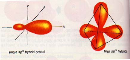 We would expect the carbon atom with four outer to have two p orbitals available for bonding. However, it has been discovered that carbon does not usually form two p orbital Instead, according to theory, the s and p orbitals of carbon merge to form four equivalent hybrid orbitals. If one s and three p orbitals merge, four sp3 hybrid orbitals are formed. The orbitals are arranged in tetrahedral fashion.