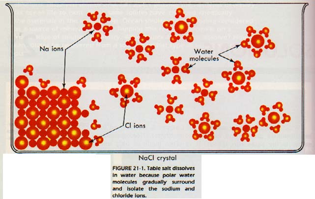 Table salt, NaCl, is an ionic compound made of sodium and chloride ions. If a salt crystal is put in water, the polar water molecules are attracted to ions on the crystal surfaces. The water molecules gradually surround and isolate the surface ions. The ions become hydrated, Figure 21-1.