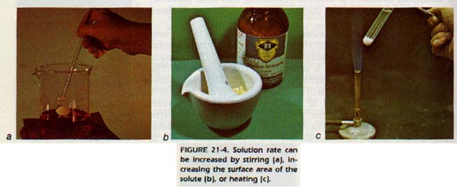 This motion exposes fresh surface, thus increasing solution rate. Finally, with increased kinetic energy, particles are more easily removed from the crystal. The kinetic energy of a system is increased by heating the mixture.