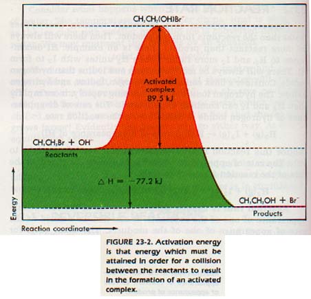 From Figure 23-2 we can see that the activation energy is 89.5 kJ per mole or CH3CH2Br. We can also see that the enthalpy change for the reaction is -77.2 kJ.