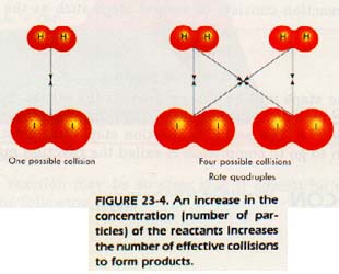 7. Increasing the concentration of a reactant increases the rate of reaction by increasing the number of collisions. Increasing the pressure of a gas or the surface area of a heterogeneous reactant has the same effect on the reaction rate.