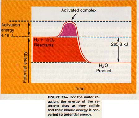 Figure 23-6 is a graph which shows the energy changes involved in the reaction of hydrogen with oxygen. This graph can be thought of as a map of the potential energy possessed by the atoms and molecules taking part in a reaction.