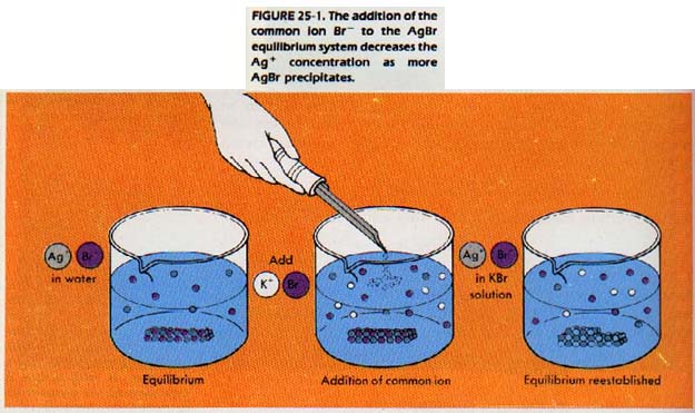 This reaction is an example of the common ion effect. The addition of a common ion removes silver ion from solution, and causes the equilibrium to shift toward the solid silver bromide. We could also say the addition of a common ion decreases the solubility of a substance in solution.