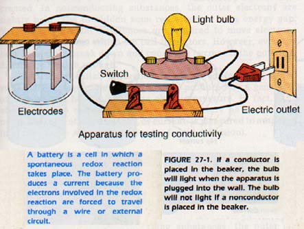 If we plug the apparatus in Figure 27-1 into an electric outlet, the bulb does not light because the circuit is not complete. Whenever we complete the circuit with a conducting substance, the bulb does light. In the circuit shown, a conducting substance in the beaker would complete the circuit. We now have an easy way of observing which substances are conductors of electricity.