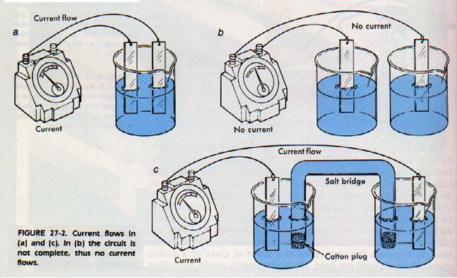 If we place the two metal plates into separate beakers containing salt solutions, as shown in Figure 27-2, no current flows. When we add the salt bridge to the system as shown, a current is produced. The salt bridge is a U-tube containing an ionic substance in solution. What is the function of the salt bridge? It connects the two separate solutions without mixing them. Can the solutions be mixed and still be used to: produce a current? In this chapter, we shall answer these and other related questions.