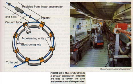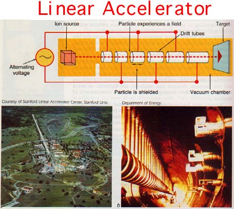 In a linear accelerator a particle is introduced using a device similar to the mass spectrometer ion-beam generator, Figure 28-3. The charged particle in motion will be affected by an electromagnetic wave. A radio wave is used to "push," or accelerate, the particle down the "pipe" forming the core of the accelerator.