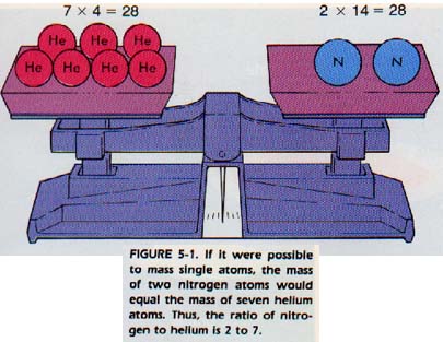 Let us compare the mass of two helium atoms to that of two nitrogen atoms. The ratio would be 2 x 4 to 2 x 14, or 2 to 7. If we compare the mass of 10 atoms of each element, we will still get a 2 to 7 ratio. No matter what number of atoms we compare, equal numbers of helium and nitrogen atoms will have a mass ratio of 2 to 7. In other words, the numbers in the atomic mass table give us the relative masses of the atoms of the elements.
