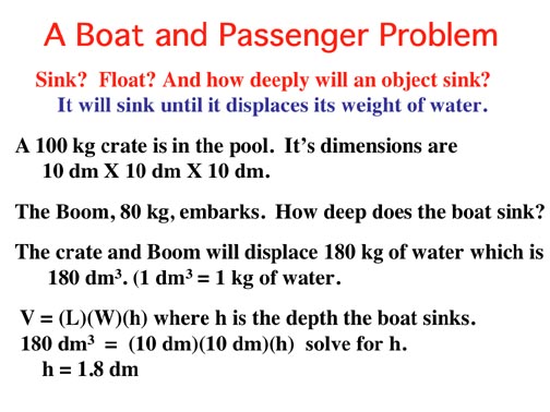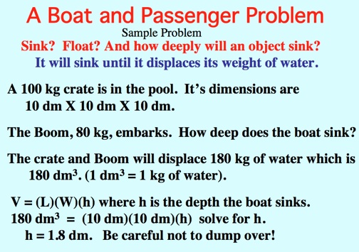 For example: If the crown weighs 1000 grams in air and 900 grams under water, the buoyant force is 100 grams. Because the density of water is 1.0g/cm3, cm3 can be substituted for grams to get the volume of the crown.