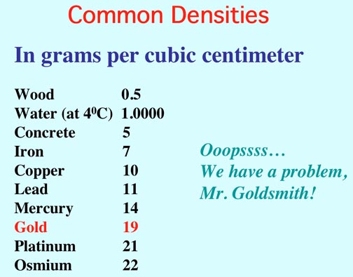 Density = mass/volume, so this density is 1000g/100 cm3 or 10 g/cm3. This is a long way from 19 g/cm3, the density of gold!