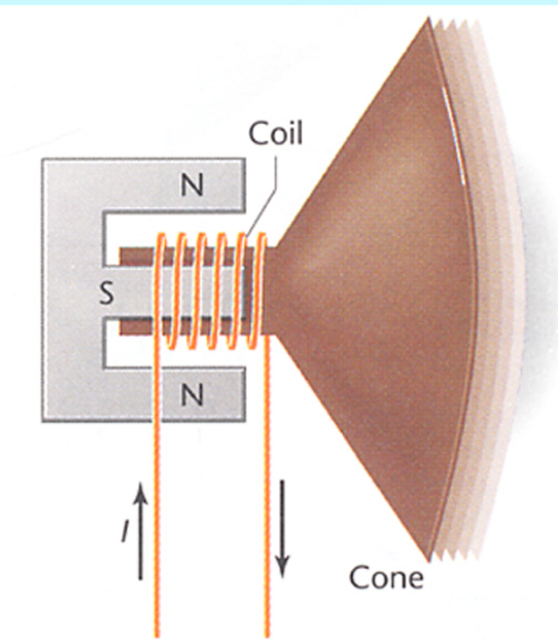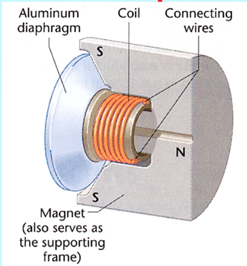 The Electromagnetic Field interacts with the Permanent Magnet Field. The vibrations ---> Sound Waves.