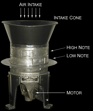 The Siren is a centrifugal air pump that takes in air in through the resonator and blows it out of the side holes. The holes are opened and closed as the pump rotates causing Compressions and Rarefactions.