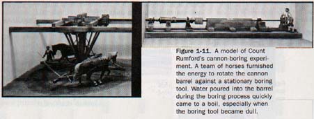 Count Rumford was in charge of the boring of brass cylinders for the construction of cannon barrels in Bavaria. Figure 1-11 shows a model of Rumford's apparatus.