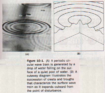 A stone, or a single drop of water, falling into a quiet pond produces the familiar wave pattern on the surface of the water shown in Figure 10-1.
