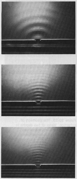 In Figure 10-21 the deep water representing the medium of higher propagating speed is in the lower portion of the photograph. The wave moves toward the shallow water in the upper portion. The boundary between the deep and shallow water is parallel to the advancing wave front. Thus each incident wave crest approaches the shallow region along the normal to the boundary.