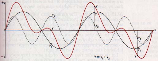 The component waves yl and y2 in Figure 10-25 are simple sine waves. Observe that the frequency, .f2 wave y2 is twice the frequency of wave y1. That is,
