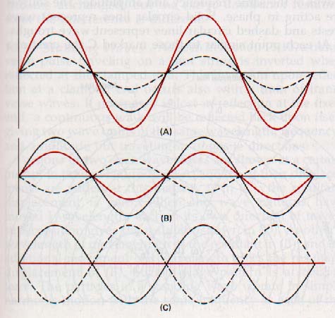 In Figure 10-26(A) two periodic waves with the same frequency and in phase are traveling in the same direction. They interfere constructively. The resultant periodic wave, shown in color, has the same frequency as the component waves but has an amplitude equal to the sum of the component amplitudes.