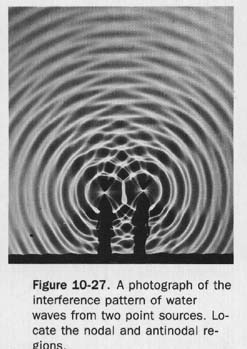 Figure 10-27 is a photograph of an interference pattern produced in a ripple tank by two identical circular waves emanating from two points. The two waves are in phase at their sources. That is, the two probes that generate the waves by their vibrations are interference pattern of water moving up and down together.
