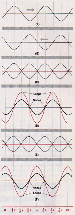 Another a wavelength of movement gives the resultant in (E), and an additional movement of a wavelength gives the resultant displacement in (F). Such a wave pattern is a standing wave. The particles in a standing wave vibrate in simple harmonic motion with the same frequency as each of the component waves.