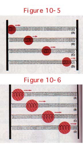 If the coils at the left end of the spring are stretched apart instead of compressed, a rarefaction is formed. When released, the rarefaction travels along the spring just as the compression did. This effect is shown in Figure 10-6. These pulses propagate along the spring by displacing the particles of the spring in directions parallel to the direction the pulses are traveling. They are examples of longitudinal pulses.