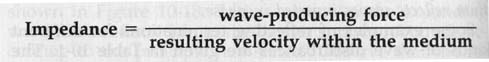 10.11 Impedance If we were to apply the same wave producing force to a light string and to a heavy rope, two entirely different displacement velocities would result. The string would experience a very large displacement velocity compared with that of the rope. We could say that the ratio of the wave-producing force to the displacement velocity is quite small for the string and quite large for the rope. In the study of waves, this ratio of the applied wave-producing force to the resulting displacement velocity is called the impedance of the medium.