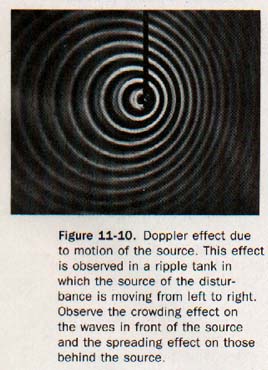 The change in pitch produced by the relative motion of the source and observer is known as the Doppler Effect. Of course, the frequency of the sound emitted by the source remains unchanged as does the velocity of the sound in the transmitting medium. Figure 11-8 illustrates this principle.