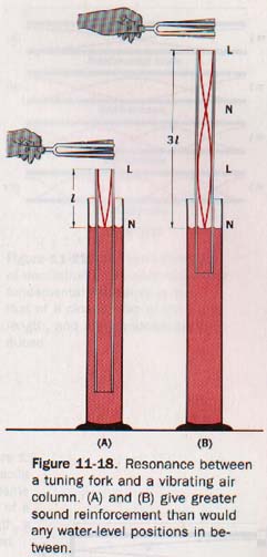 Figure 11-18 illustrates a method of producing resonance between a tuning fork and a column of air. The vibrating fork is held above the hollow cylinder immersed in water. The length of the air column is gradually increased by raising the cylinder.