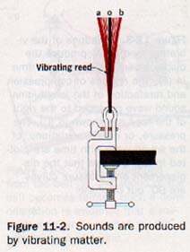 Such vibrating elements as reeds (clarinet, gooseophone), strings (guitar, vocal cords), membranes (drum, loudspeaker), and air columns (pipe organ, flute) initiate sound waves.