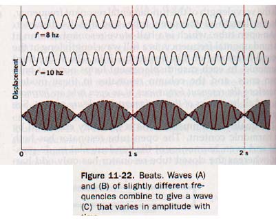 In curve (A) the frequency is 8 hz, and in (B) it is 10 hz. Curve (C) shows the combined effect of these two waves at a fixed point in their pathway. This resultant wave varies periodically in amplitude with time. Such amplitude pulsations are called beats.