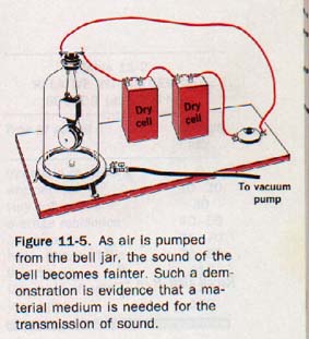 These effects show that it is increasingly difficult to effect the transfer of sound energy to the air as the density of the air decreases. This demonstration suggests that if all the air could be removed from the bell jar, no sound would be heard. Sound does not travel through a vacuum; it is transmitted only through a material medium.