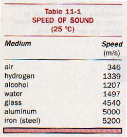 In general the speed of sound varies with the temperature of the transmitting medium. For gases the change in speed is rather large. For liquids and solids, however, this change in speed is small and is usually neglected. Representative values for the speed of sound waves in various media are given in Table 11-1. (See also Appendix B, Table 17.)
