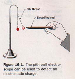 16.2 Two Kinds of Charge We can detect the presence of an electrostatic charge by means of an instrument called an electroscope. The simplest kind of electroscope is a small ball of wood pith or styrofoam suspended by a silk thread. This electroscope is more sensitive if the pith ball is coated with aluminum or graphite. Such an instrument is shown in Figure 16-1.