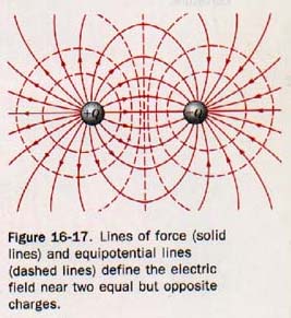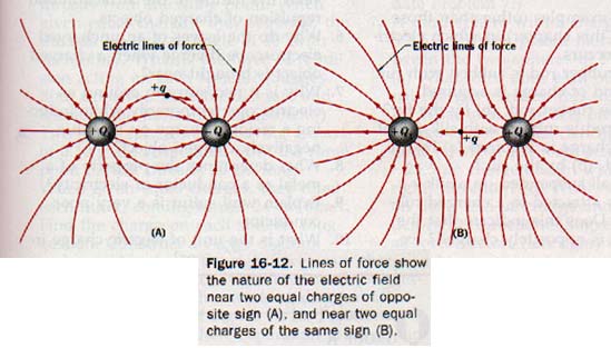 In Figure 16-12(A), electric lines of force are used to show the electric field near two equally but oppositely charged objects. At any point in this field the resultant force acting on a test charge +q can be represented by a vector drawn tangent to the line of force at that point. The electric field near two objects of equal charge of the same sign is shown by the lines of force in Figure 16-12(B). The resultant force acting on a test charge +q placed at the midpoint between these two similar charges would be zero.