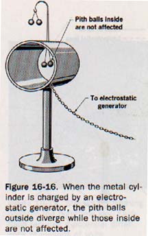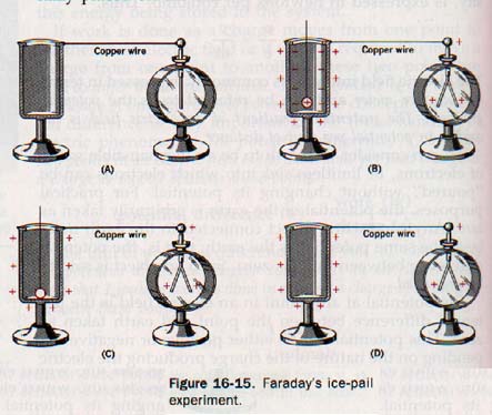 By pulling on the silk thread, he turned the bag inside out and found the charge was again on the outside. The inside of the showed no electric charge in either position. Faraday connected the outer surface of an insulated metal pail to an electroscope by means of a wire, as shown in Figure 16-15(A). He then lowered alternately charged metal ball supported by a silk thread into the pail. The leaves of the electroscope diverged (B), indicating a charge by induction.