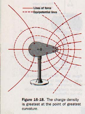 16.33 Discharging Effect of Points In Figure 16-18 lines of force and equipotential lines are shown more concentrated at the small end of the charged conductor. Geometry indicates that the intensity of the electric or potential gradient, in this region is greater than where around the conductor.