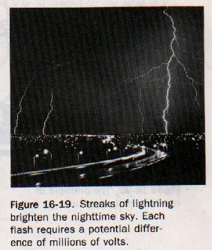 Lightning is a gigantic electric discharge in which electric charges rush to meet their opposites. The interchange can occur between clouds or between a cloud and the earth. See Figure 16-19.