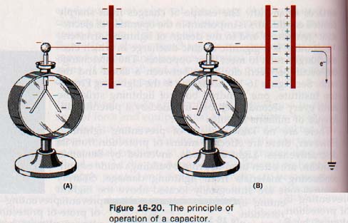 Now suppose a grounded conductor is brought near charged conductor, as shown in Figure 16-20(B). A negative charge is induced on this second conductor as electrons are repelled to ground by the negative field the first conductor. The leaves of the electroscope collapse. The closer we move the grounded plate to charged conductor, the more pronounced is this effect.