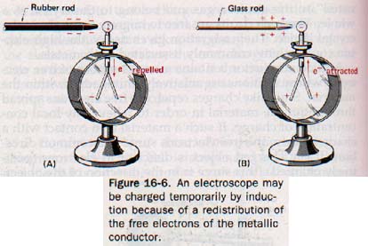 Similarly, a glass rod that has been stroked with silk temporarily induces a positive charge on the leaves of an electroscope by attracting electrons up through the stem to the knob. See Figure 16-6(B).