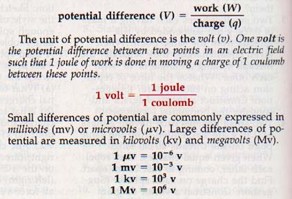 The unit of potential difference is the volt (v). One volt is the potential difference between two points in an electric field such that 1 joule of work is done in moving a charge of 1 coulomb between these points.