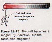 A piece of hardened steel is not so strongly magnetized by induction but retains a greater residual magnetism when removed from the induction field. There is no significant difference in the process if the iron bar in Figure l9-14 is brought into contact with one of the magnet poles. The magnetization process is somewhat more efficient due to the reduction of the air gap. See Figure 19-15.