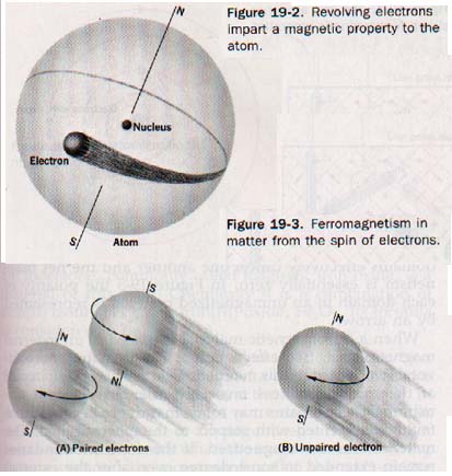 Two kinds of electron motion are important in this modern concept of magnetism. First, an electron revolving about the nucleus of an atom imparts a magnetic property to the atom structure. See Figure 19-2.