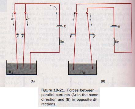 19.9 Magnetic Field and a Charge in Motion Shortly after Oersted's discovery, the French physicist Ampere determined the shape of the magnetic field about a conductor carrying a current. He had discovered that forces exist between two parallel conductors in an electric circuit. If the two currents are in the same direction, the force is one of attraction; the force is one of repulsion if the currents are in opposite directions. See Figure 19-21.