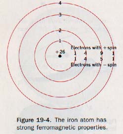 The atoms of other elements achieve this stable configuration by forming chemical bonds. Only in certain transition elements that have incomplete inner shells do unpaired electrons result in ferromagnetic properties. The electron configuration of the iron atom, Figure 19-4, shows four unpaired electrons in the third principal quantum level. The similarly oriented spins of these electrons, enhanced by the influence of nearby atoms in the metallic crystal, account for iron's strong ferromagnetism.