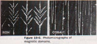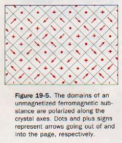 From the preceding discussion, it would seem that every piece of iron should behave as a magnet. However, such is not the case. Atoms are grouped in microscopic magnetic regions called domains. The atoms in each domain are magnetically polarized parallel to a crystal axis. In a polycrystalline specimen, ordinarily these axes (and the domains) are oriented in all possible directions. The domains effectively cancel one another and the net magnetism is essentially zero. In Figure 19-5 the polarity of each domain in an unmagnetized material is represented by an arrow.