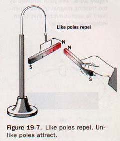 When the N pole of a second magnet is brought near the N pole of the suspended magnet, the two repel each other. A similar action is observed with the two S poles. When the S pole of one magnet is placed near the N pole of the other magnet, they attract each other. Such experiments show that like poles repel and unlike poles attract.