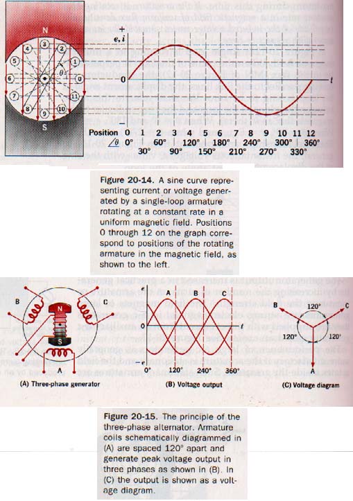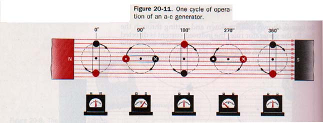 The generator induces a sinusoidal emf across the armature turns. The current in the armature circuit alternates. The frequency of the generated current is expressed in hertz; one hertz is equivalent to one cycle per second. An a-c generator may be modified for a pulsating d-c output. The d-c generator is self-excited.