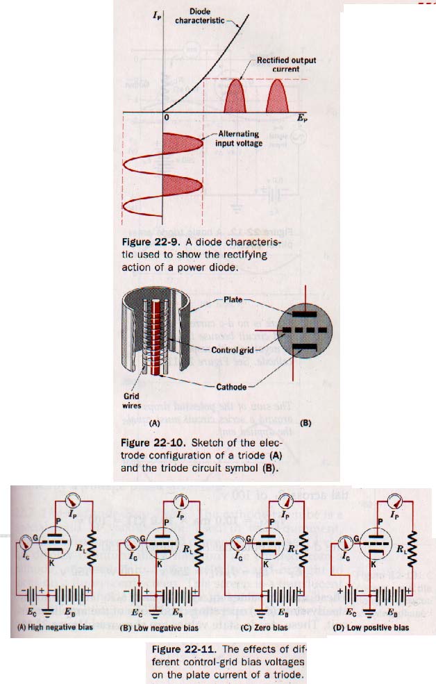The Triode has a control grid between the cathode and the anode (plate). Varying the charge in the grid, controls the current flow through the tube.