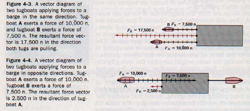 The resultant force vector is 17,500 n in the direction of the towline. Figure 4-4 shows a vector diagram representing two tugboats pulling in opposite directions on a barge. Even though the forces act on extended objects such as opposite ends of the barge, the vectors may be considered as acting at the same point. The resultant force vector is 2,500 n in the direction of tugboat A.