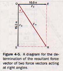 Suppose one force of 10.0 n acts eastward upon an object. Another force of 15.0 n acts southward upon the same point. Since these forces act concurrently upon the same point, the vector diagram is constructed with the tails of both vectors at O, See Figure 4-5. FE tends to move the object eastward. FS tends to move the object southward.
